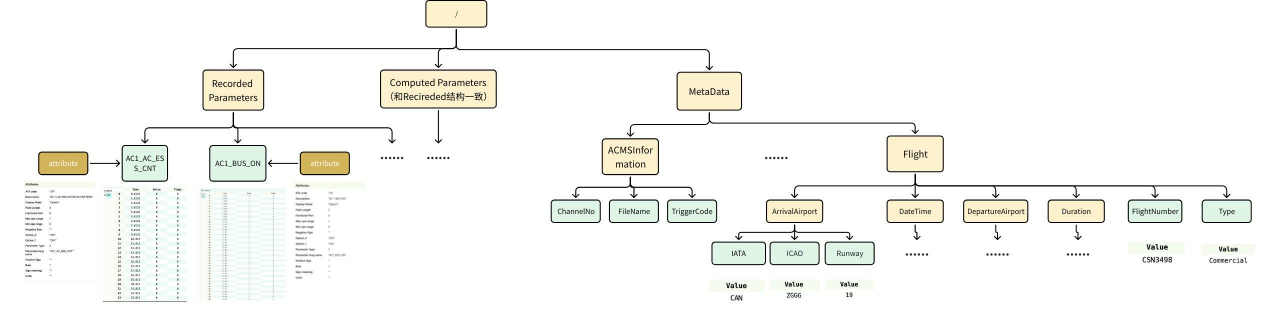 Given the enormous data volume, efficient storage becomes critical. In the HDF5 format, data is organized hierarchically using Groups and Datasets, with metadata stored in Attributes. Each parameter is stored as a separate dataset—a 2D table consisting of a time column and a value column. Internally, HDF5 manages hierarchical objects using internal metadata trees and heaps to map groups to datasets and attributes.
